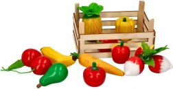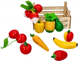 Caisse en bois remplie de fruits et de légumes pour petits cuisiniers et marchands, idéale pour jouer à la boutique ou au marché.