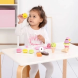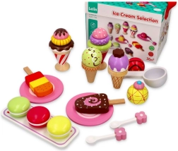 Les glaces et sucreries en bois colorées encouragent les enfants à créer leur propre histoire de glacier et à jouer des rôles.