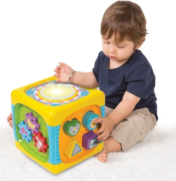 Chaque face propose un jeu différent : un petit piano avec notes et mélodies, un tambour changeant de couleur après un coup, un trieur de formes avec de grandes pièces, des roues dentées colorées, de petits animaux coulissants et un miroir pour découvrir son propre reflet. La cube est fabriquée à partir de matériaux de qualité, sûrs, et convient dès 8 mois.