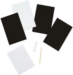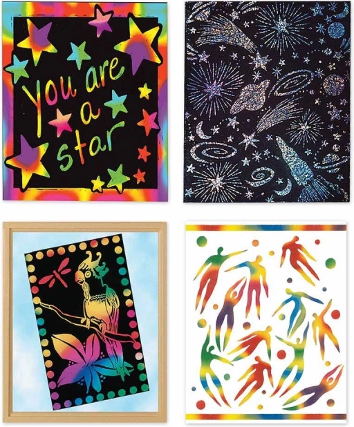 Avec cet ensemble, enfants et adultes créent des œuvres originales. Il suffit de gratter délicatement la surface noire avec le bâtonnet fourni pour révéler des couleurs arc‑en‑ciel ou holographiques. Les images finies peuvent être facilement encadrées et exposées.