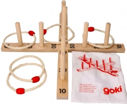 Ce jeu comprend une base en croix avec 9 chevilles en bois et cinq anneaux en corde avec un élément en bois pour faciliter le lancer. Le jeu est fabriqué en bois de qualité, garantissant un plaisir durable.