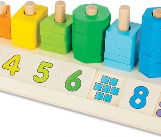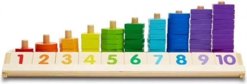 Sous chaque carré avec chiffre se trouvent des points illustrant la quantité, et au dos du carré le nombre est écrit en anglais – idéal pour une première approche d’une langue étrangère. Grâce à sa fabrication robuste en bois écologique, le jouet est durable et sûr pour les enfants dès 2 ans. Il développe parfaitement la motricité fine, la coordination œil-main et la pensée logique.
