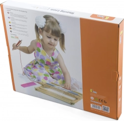 L’emballage contient tout le nécessaire pour un démarrage immédiat : une chaîne blanche déjà tendue et deux pelotes colorées (bleu et rouge) sur des navettes. Une latte de levage spéciale soulève alternativement les fils de chaîne, rendant le passage du fil rapide et clair. Un emballage coloré et esthétique en fait un cadeau éducatif parfait pour les petits créateurs.