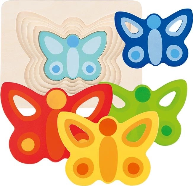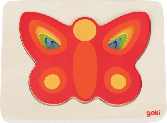 Découvrez le puzzle à encastrement superposé et ludique avec des papillons colorés de la marque GOKI. En assemblant les pièces, les enfants s’amusent tout en développant leur motricité fine, la reconnaissance des couleurs et la pensée logique. Le puzzle comprend cinq pièces et, à chaque couche, ne convient qu’un seul papillon, ce qui favorise la patience et un apprentissage progressif.