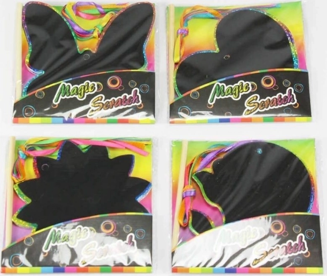 Procédé simple, résultat spectaculaire – grattez les lignes préimprimées et, sous la couche noire, apparaissent des couleurs arc-en-ciel. Les images terminées peuvent être accrochées immédiatement grâce aux rubans colorés pour décorer la chambre d’enfant. Idéal pour créer à la maison, à l’école ou en atelier.