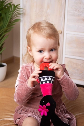 Ce petit lapin tout doux en velours a été conçu pour soutenir le développement des sens dès les premiers jours de vie. Les oreilles bruissantes invitent à l’exploration tactile et renforcent la prise, le pouet dans le ventre éveille l’ouïe et l’anneau de dentition soulage les gencives sensibles lors des poussées dentaires. Grâce aux éléments noir‑et‑blanc contrastés, le jouet capte facilement l’attention même des tout‑petits.
