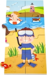 La scène colorée de plage incite à assembler et ouvre la porte aux discussions sur l’été, l’eau et les comportements sécuritaires à l’extérieur. Les enfants enrichissent ainsi leur vocabulaire et leur imagination.