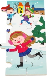 Une scène hivernale colorée avec des enfants dans la neige motive à assembler et développe la perception des couleurs, des détails et des situations.