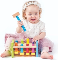 Cette version moderne du banc à marteler en bois de la marque WOODY apporte aux enfants le plaisir de découvrir et d’apprendre. Les chevilles sont reliées par un berceau en plastique, de sorte que chaque coup de marteau a un effet immédiat et visible – une cheville s’enfonce, l’autre ressort. Les enfants entraînent ainsi, en jouant, la force de leur prise, la précision et la patience.