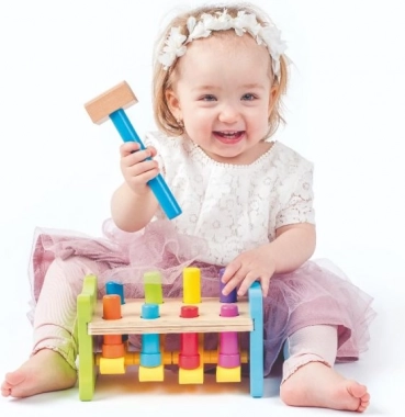 Le set comprend un socle robuste, 8 chevilles en bois et un marteau résistant. Le jouet est conçu pour la sécurité et la durabilité. La marque WOODY s’inscrit dans la tradition tchèque des jouets en bois de qualité et teste régulièrement ses produits selon les normes internationales, dont beaucoup portent le label « Jouet sûr ».
