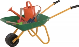 La brouette inclut des outils de jardinage amusants comme un arrosoir et une pelle, qui enrichissent le jeu.