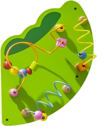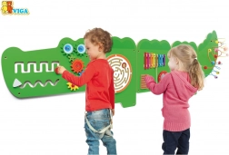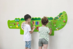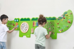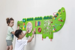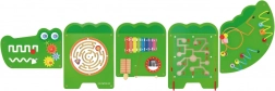 Le tableau mural Crocodile, divisé en cinq parties, propose aux enfants diverses activités : partie tête avec labyrinthes et engrenages, labyrinthe circulaire avec bille, panneau musical avec xylophone coloré et surface à gratter, labyrinthe magnétique avec deux stylos magnétiques, et queue avec trois parcours de perles 3D. Chaque section stimule une compétence différente et incite les enfants à explorer.