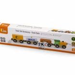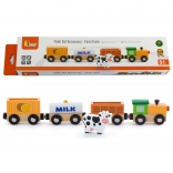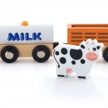 L’ensemble comprend une locomotive et trois wagons — une citerne marquée MILK, un wagon à bétail avec petite vache et un wagon de chargement. Les bords lisses et la conception durable conviennent parfaitement à la chambre d’enfant comme aux écoles maternelles.