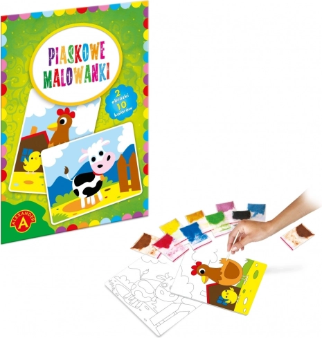 Le jeu artistique de peinture au sable consiste à dévoiler progressivement les différentes parties prédécoupées de l’image afin de mettre à nu la surface adhésive du fragment sélectionné. Chaque fragment découvert est ensuite saupoudré de sable de la couleur indiquée par le modèle illustré dans le mode d’emploi et sur la boîte.