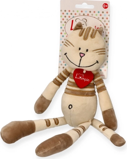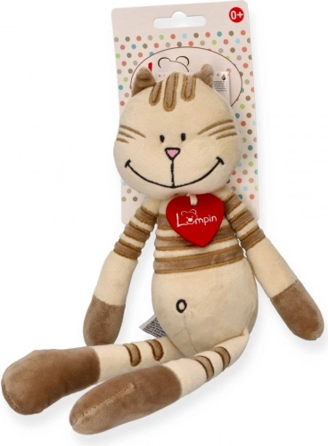 Adorable chat en peluche avec une douce fourrure beige et des rayures brunes, compagnon idéal comme premier doudou pour les bébés et les enfants plus grands. Il a de longues pattes, un large sourire et un petit cœur en feutrine autour du cou. Léger, facile à saisir et sûr dès l’âge de 0+ . Pour un entretien facile, il peut être lavé à la main à 30 °C.
