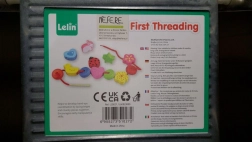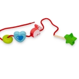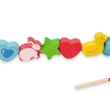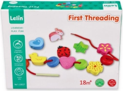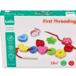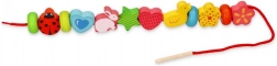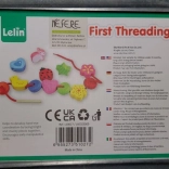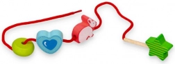 Cordelette textile avec embouts en bois pour un enfilage facile, aide au développement de la motricité fine.