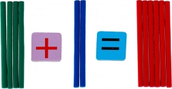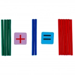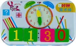 - 50 bâtonnets en bois colorés, 4× aiguilles d’horloge, 28 cartes magnétiques avec chiffres et signes mathématiques, étui métallique