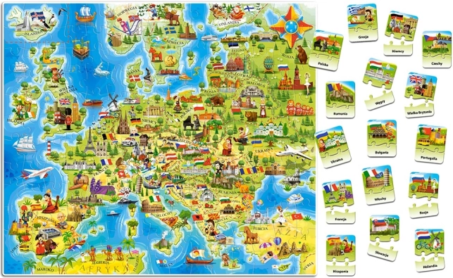 Le coffret comprend également 32 pièces de quiz, à utiliser comme jeu complémentaire – en bas figure le nom du pays et en haut l’illustration correspondante. La carte assemblée sert de guide pour les défis du quiz et aide les enfants à approfondir leurs connaissances sur l’Europe. Les puzzles sont présentés dans une jolie boîte cadeau, parfaite pour offrir.