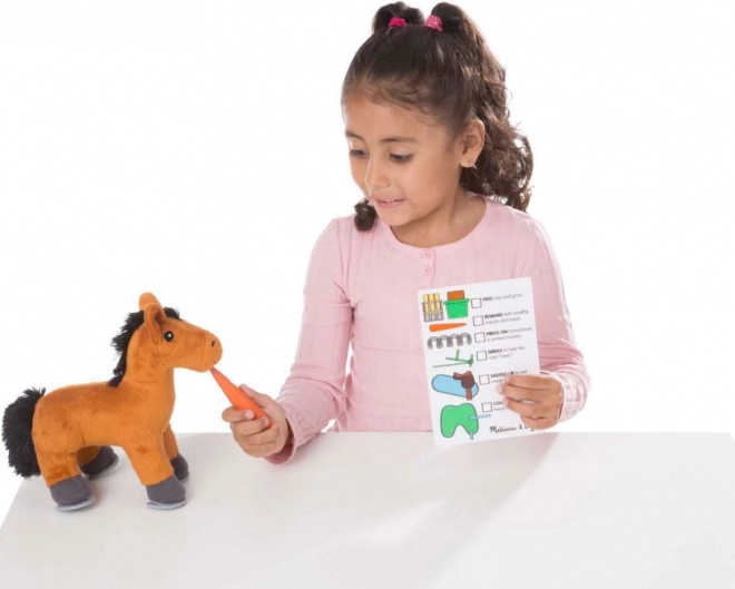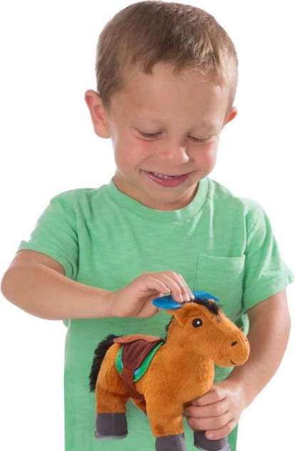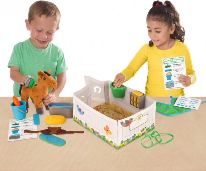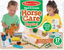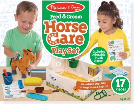 Le jouet favorise le développement de l’empathie, du jeu de rôle et de l’imagination. Les enfants peuvent brosser le cheval, le nourrir et le coucher dans une petite écurie, en suivant de simples cartes de tâches. Le set convient aux enfants dès 3 ans et répond à la norme CE.