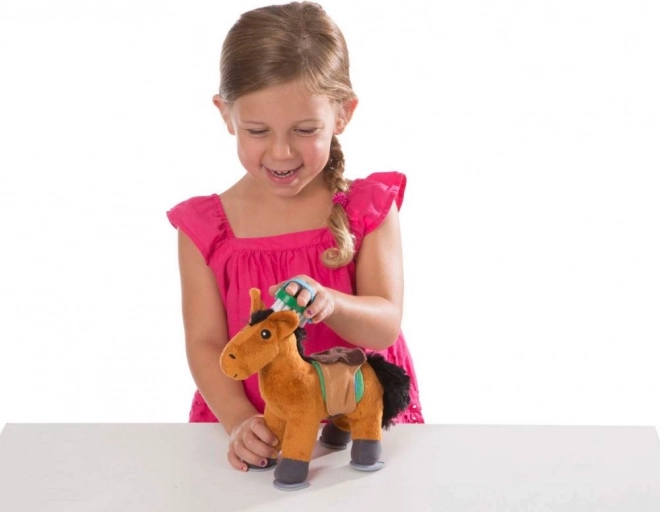 Ce set de soins avec un doux cheval en peluche est le jouet idéal pour les petits amoureux des chevaux. Il comprend des accessoires comme une brosse, une éponge, une carotte et une mangeoire, qui favorisent un jeu de ferme réaliste et l’apprentissage des soins aux animaux. Grâce aux couleurs vives et aux matériaux agréables, les enfants vont adorer jouer.