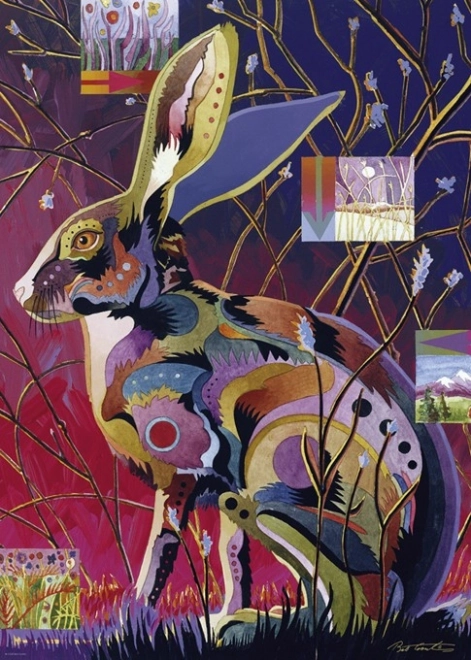 Ce puzzle design propose une composition décorative marquée de l’artiste Bob Coonts, installé dans les Rocheuses et renommé pour son style coloré capturant la beauté des animaux. Le motif du lapin ravira les amoureux de la nature comme les collectionneurs d’illustrations originales.
