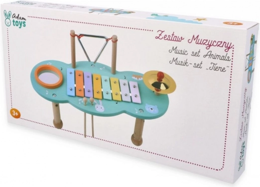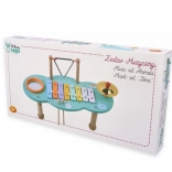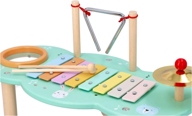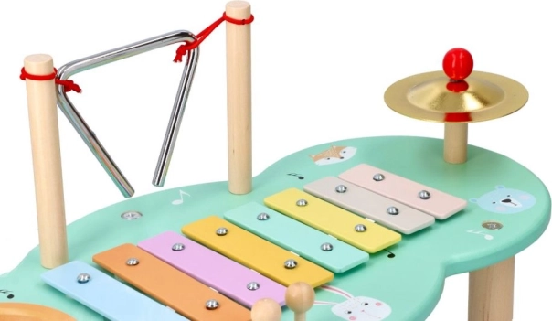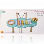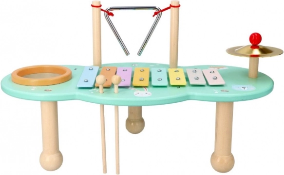 - Table avec plateau et pieds en bois, xylophone, triangle, cymbale, 2 maillets