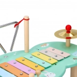 Tous les instruments de percussion préférés au même endroit : xylophone, triangle et cymbale sur une structure en bois robuste avec plateau et pieds illustrés pour un jeu en toute sécurité.