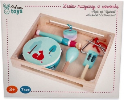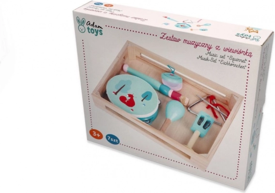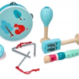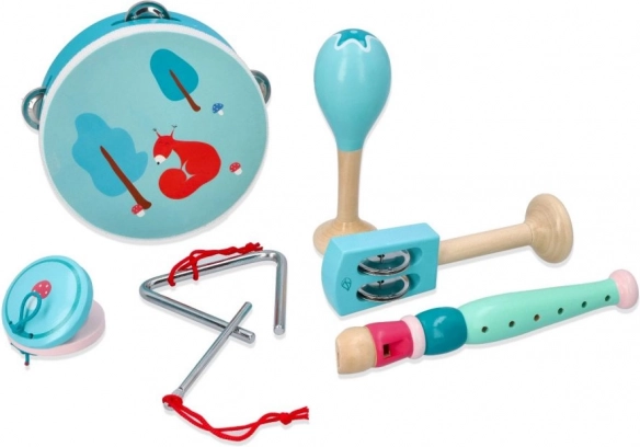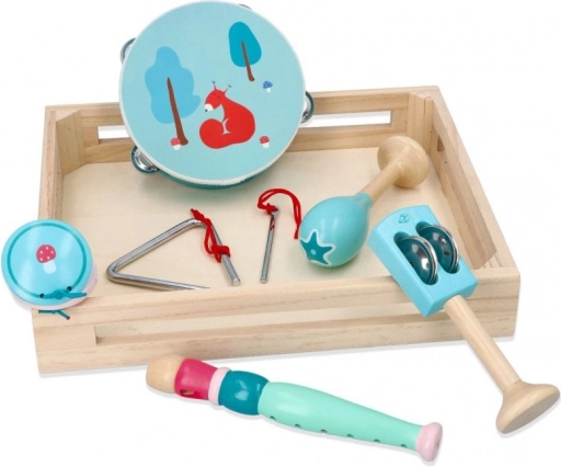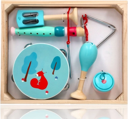 Tambourin avec motif renard/écureuil, maracas, triangle, harmonica et d’autres instruments dans d’agréables teintes menthe développent le sens du rythme et la coordination des mains.