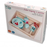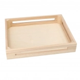 Toutes les pièces du set sont soigneusement rangées dans un plateau en bois avec poignées – transport facile, ordre et stockage sûr à la maison comme à la maternelle.