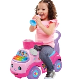 À l’avant se trouve un clavier avec deux modes : il joue 5 mélodies entraînantes de type marche ou permet un jeu libre pour que l’enfant crée sa propre musique. La poignée arrière offre un appui pour les premiers pas et, sous l’assise, se trouve un compartiment pratique pour les petites affaires.