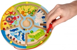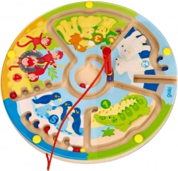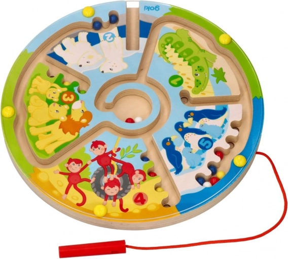 Le labyrinthe magnétique en bois GOKI au motif Zoo apprend aux enfants à guider les billes à l’aide d’un stylet magnétique, et entraîne la motricité fine, la coordination œil–main ainsi que la reconnaissance des couleurs et des chiffres. Le plexiglas résistant protège les billes, le format compact de 23 cm de diamètre et le stylet attaché par une ficelle en font un jouet idéal dès 3 ans.