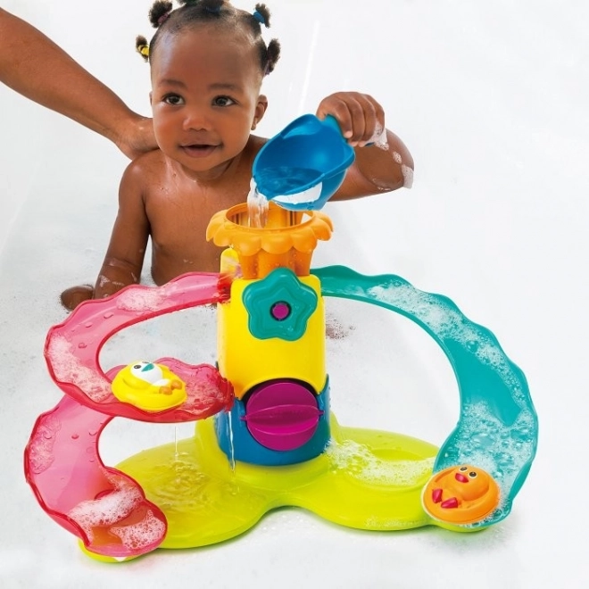 Découvrez le monde ludique avec un aquaparc pour baignoire doté de deux toboggans et d'éléments mobiles pour s'amuser pendant le bain.