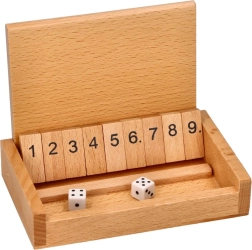 Le jeu de société populaire Shut the Box (Chance), en version de voyage pratique, offre des manches rapides, des règles simples et beaucoup de suspense. Lancez deux dés, additionnez les points et fermez les chiffres correspondants. Gagne celui qui parvient à fermer tous les chiffres ou à obtenir le plus petit total restant.