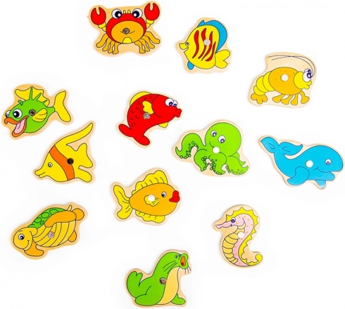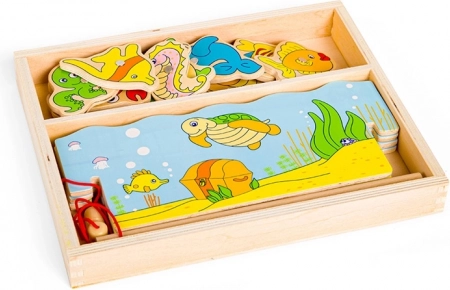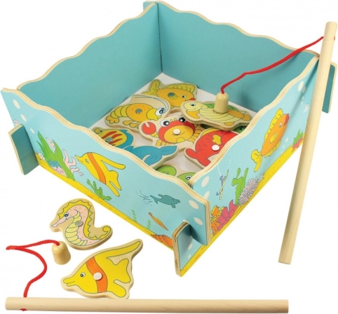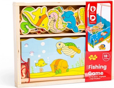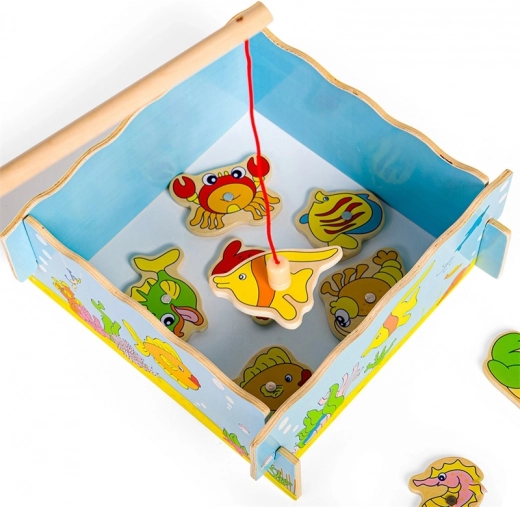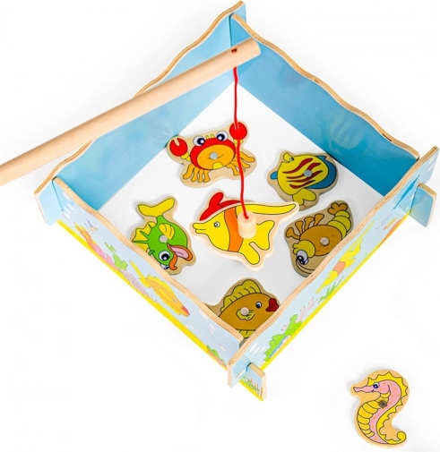 Attrapez la canne et partez à la pêche dans le monde sous-marin ! Ce jeu en bois avec aimants allie amusement et apprentissage – les enfants entraînent la motricité fine, la coordination œil–main et la patience. Le set comprend 12 créatures marines, 2 cannes et une boîte en bois robuste en forme d’aquarium. Jouet idéal pour les enfants à partir de 3 ans, en bois de qualité avec peintures sûres.