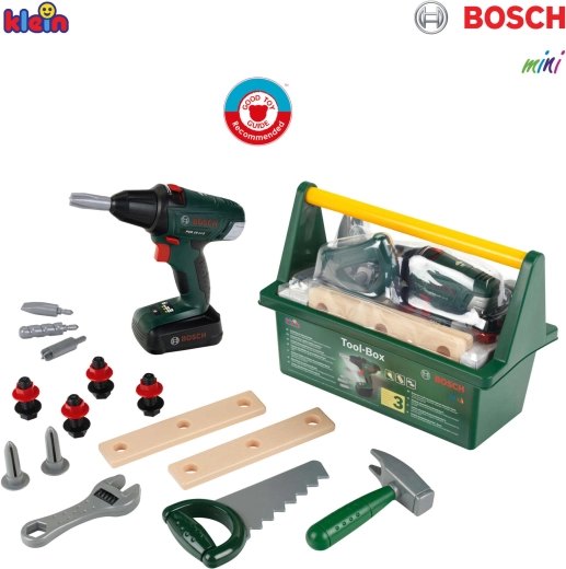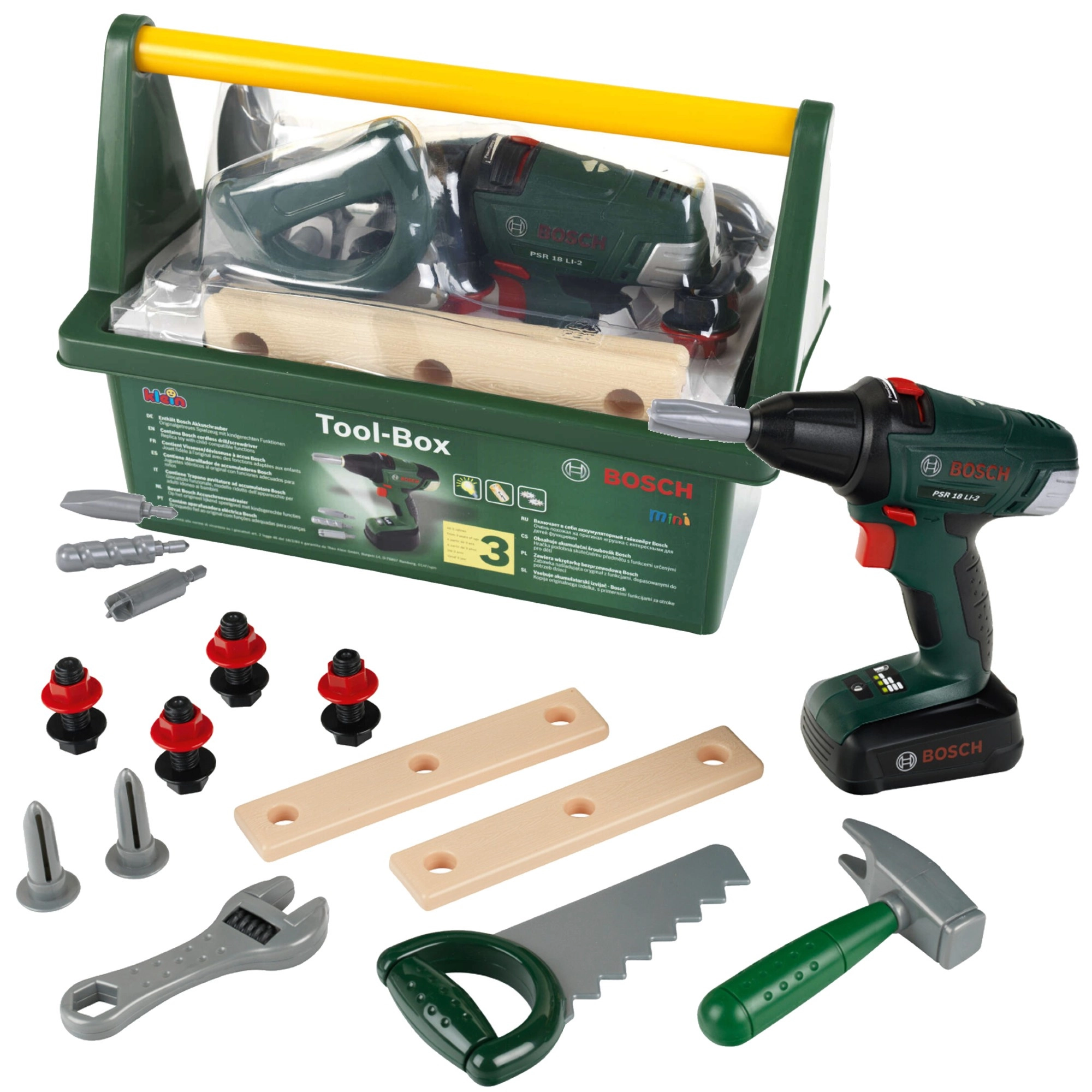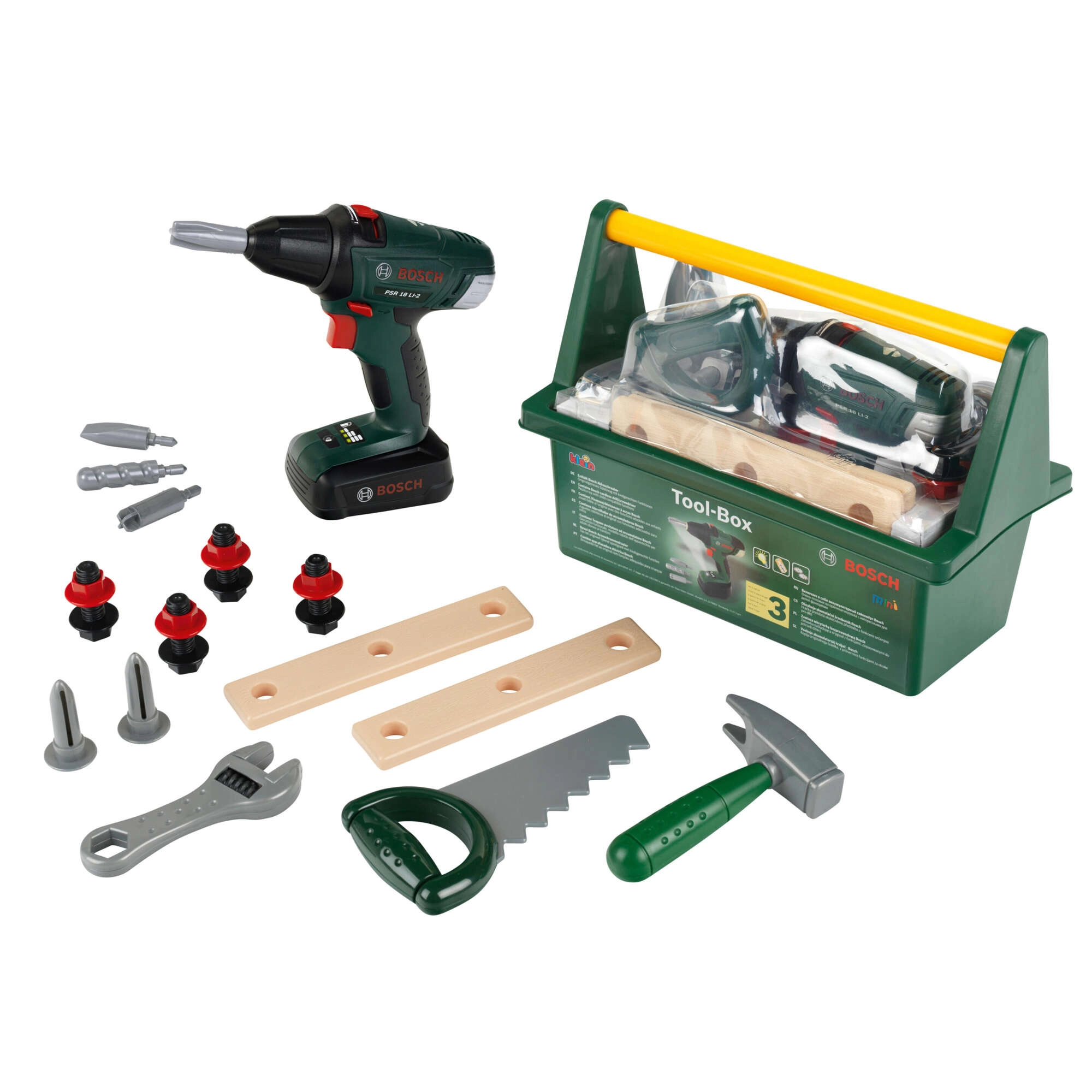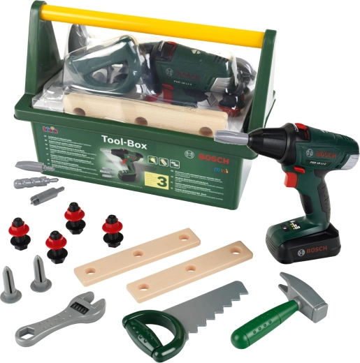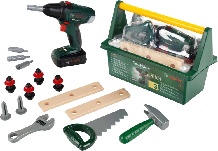 Ce coffret pour enfants de haute qualité, sous licence BOSCH, est conçu pour imiter fidèlement de vrais outils tout en restant entièrement sûr pour les enfants. La boîte à outils robuste de couleur vert foncé, avec une poignée jaune confortable, permet de garder toutes les pièces bien rangées et de les transporter facilement.
