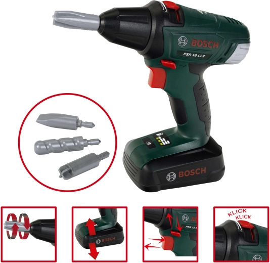 La pièce maîtresse est la perceuse/visseuse sans fil avec sons, effet lumineux et vis rotative, qui simule parfaitement le fonctionnement d’un véritable outil. Sont inclus 4 embouts interchangeables, une scie avec poignée ergonomique, un marteau, une clé à molette, 2 plaquettes en plastique percées, 4 vis et 2 clous – le tout en plastique résistant.