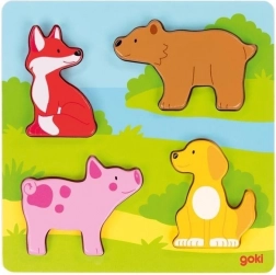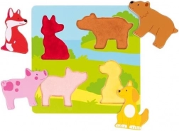 Ce puzzle en bois de qualité avec quatre animaux (renard, chien, ours, petit cochon) cache sous les découpes des surfaces tactiles imitant leur fourrure ou leur peau. Ainsi, en jouant, les enfants sollicitent la vue et le toucher et relient mieux les formes, les couleurs et les sensations.
