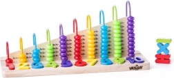 L'ensemble comprend un abacus en bois et 13 blocs colorés amovibles en forme de chiffres et de symboles +, - et =.