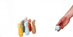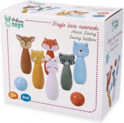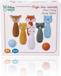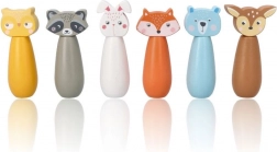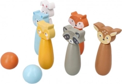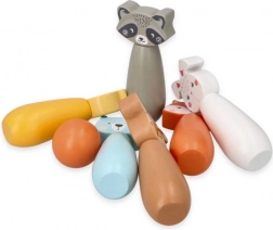 Des quilles colorées représentant le renard, l’ours, le lapin, le raton laveur, le cerf et d’autres animaux invitent au jeu et stimulent l’imagination des enfants.