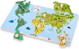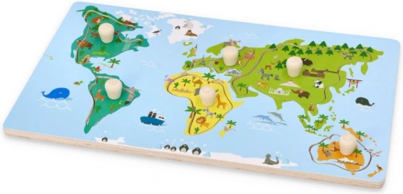 Le puzzle montre les continents avec des couleurs vives et des animaux et monuments dessinés, ce qui facilite l'apprentissage pour les enfants et rend la géographie amusante.