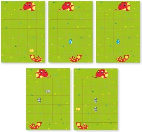 Dans ce jeu, placez la carte de jeu sur le cadre de base et, à l’aide des pièces magnétiques, créez un chemin permettant au serpent d’atteindre la nourriture illustrée. Chacune des 22 variantes de jeu propose des défis différents et augmente progressivement la difficulté.