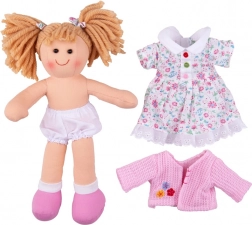 La poupée est réalisée en textile doux avec des traits brodés, ce qui la rend adaptée dès la naissance et idéale pour les câlins et les premières découvertes de jeu.