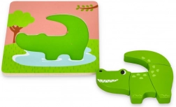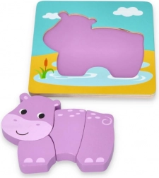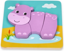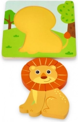 Les enfants assemblent pas à pas le crocodile, l’hippopotame, la chouette et le lion – chaque motif sur sa propre plaque en bois favorise la concentration et la joie de réussir.