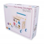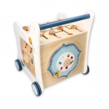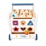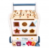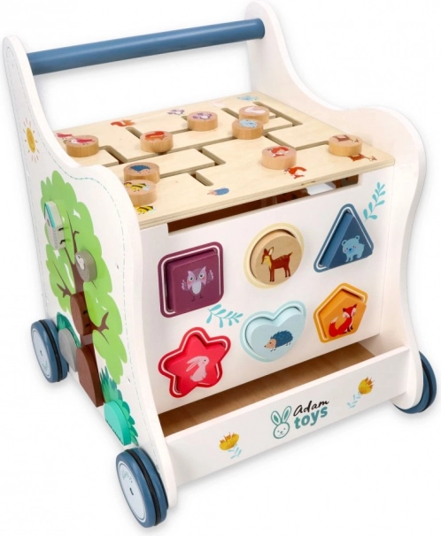 Ce chariot de marche en bois accompagne votre enfant dans l’univers des couleurs, des formes et des animaux de la forêt. Le panneau frontal propose une boîte à formes ludique, qui développe la motricité fine, la coordination œil–main et la logique. Sur le dessus, un labyrinthe à perles coulissantes encourage la patience, la planification et la représentation spatiale. Les illustrations latérales d’animaux invitent à explorer la nature et à inventer des histoires.