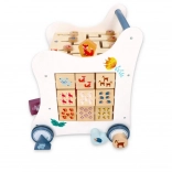 Le panneau frontal avec ses illustrations colorées et son encastrement d’animaux apprend à reconnaître les formes et les couleurs tout en développant la motricité fine et la concentration.