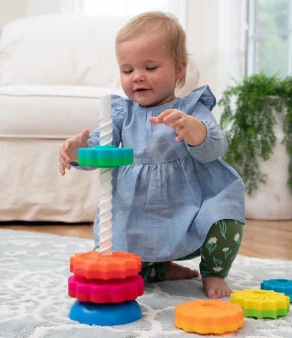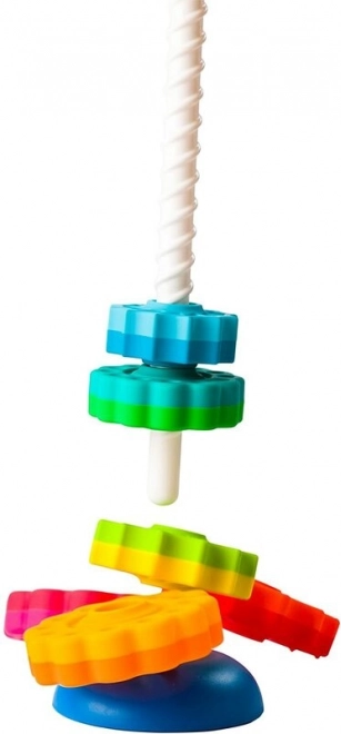 Un jouet qui aide aussi à exercer la motricité de l’enfant. 6 disques différents tournent vers le bas comme dans un tire-bouchon et se superposent selon l’imagination. Les disques alternent formes de fleurs et d’étoiles et chacun a deux couleurs.
