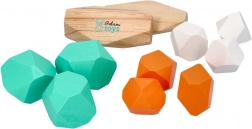 Les formes géométriques colorées, y compris des formes polyédriques turquoises, oranges et blanches, associées à une base en bois naturel, offrent une esthétique stylée.