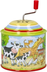 La boîte à musique est décorée d’une illustration colorée de ferme avec des personnages comme des vaches, des chevaux, des chats et des poules.