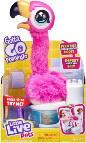 Le flamant rose interactif Little Live Pets amuse les enfants en acceptant d’être nourri avec un sable Aqua spécial, il chante, danse, parle et après le repas il va aux toilettes. Il l’annonce avec la phrase anglaise « Uh, oh, I gotta go », répète les mots de son propriétaire et, grâce au sable réutilisable, l’amusement recommence encore et encore.