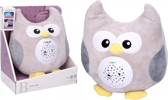 Veilleuse peluche chouette avec projection d’étoiles et mélodies apaisantes pour bébés. Douce, sûre et idéale pour l’endormissement dès la naissance.